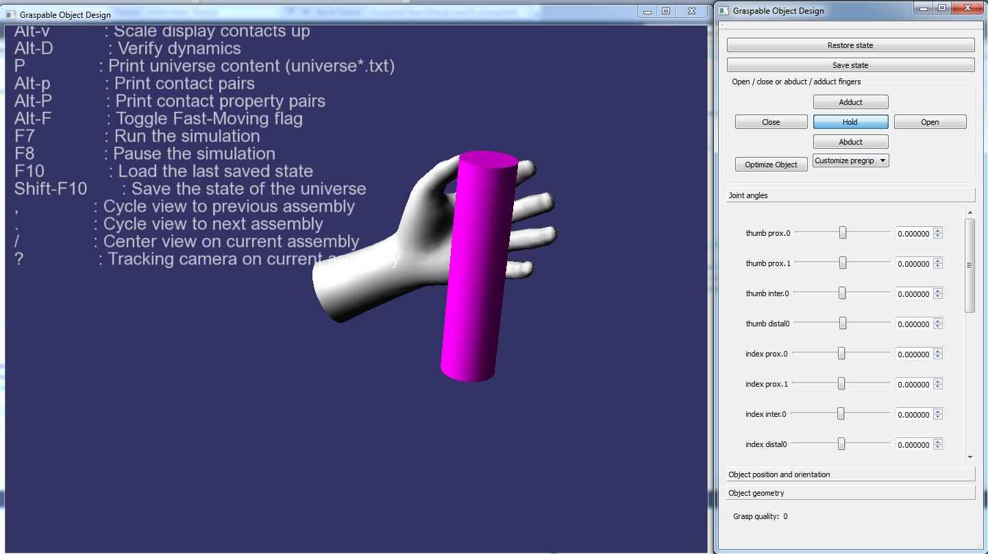 - Abstract: The objective of the proposed method is to create a design environment in which a user can receive real time feedback about the ergonomic qualities of the object they are creating. Within this tool, the user models their object, using a surface of revolution based on a Bezier curve, and positions a model of a human hand into a grasping pose on the object. The use of a Bezier curve allows the method to make simplifying assumptions about contact intersections and tangent planes at contact points, which are then used to solve the force optimization problem. The solution to this force optimization problem indicates the amount of force necessary for the object to resist external forces, such as gravity or additional forces indicated by the user. This information can then be use to infer the strain on joints of the hand, to determine how strenuous the grasp is.